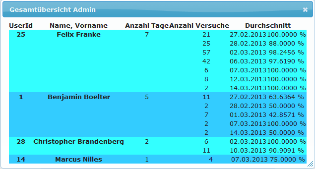 - Interessant sind die Statistiken: Es gibt Individualstatistiken sowie für Admins/Lehrer Statistiken über die Güte/ den Fortschritt der Schüler.
